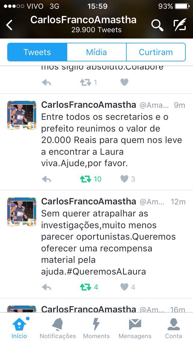 Em sua página no twitter, o Prefeito de Palmas Carlos Amastha (PSB) se manifestou sobre o desaparecimento da menina Laura Vitória Oliveira da Rocha, de 09 anos. Amastha oferece uma recompensa de R$ 20 mil reais por qualquer informação que leve a encontrar a garota, desaparecida a sete dias.