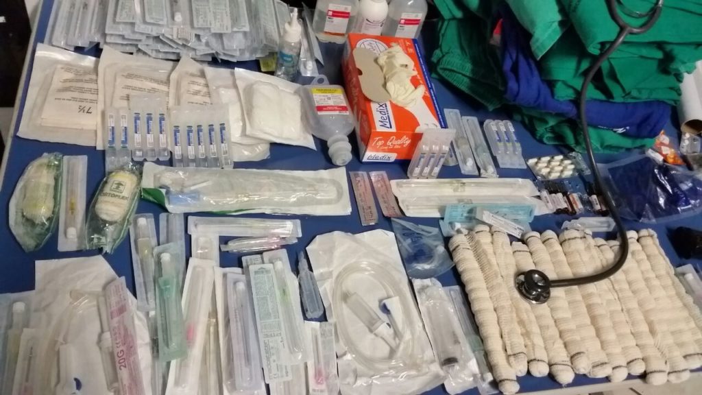 Na Casa de Thayna, que também fica localizada, na Quadra 409 Norte, próximo da kitnet, onde estavam às drogas apreendidas, os policiais civis apreenderam uma quantidade expressiva de materiais hospitalares para primeiros socorros tais como: analgésicos, anestésicos, gases, esparadrapos, bandagens, soros, materiais, de sutura e insumos para pequenas cirurgias.