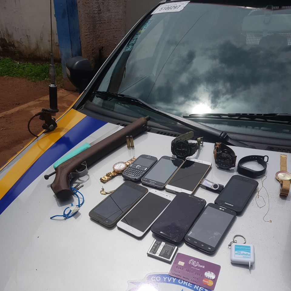 Com os suspeitos estavam os diversos objetos das vítimas, dentre eles seis celulares, cinco relógios, dinheiro, cartão de crédito, um cordão e uma aliança de ouro. Diante do flagrante os infratores foram encaminhados à delegacia para as providências cabíveis. Dois dos envolvidos, um adulto e um adolescente, já possuem passagem pela polícia por roubo.