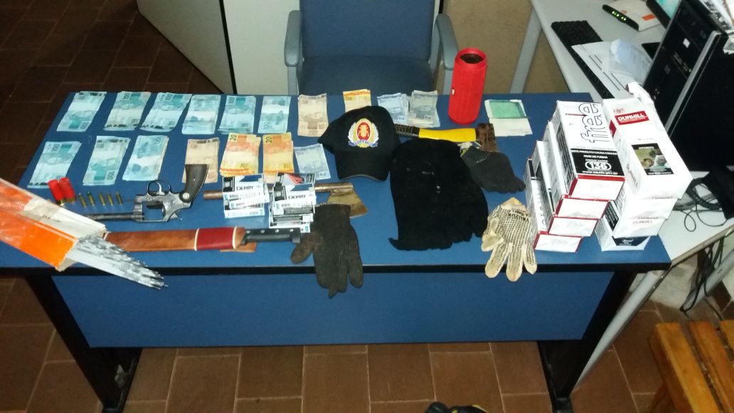 Dentro do veículo abandonado havia um revólver, diversas munições, um capuz, dois pares de luvas, nove maços de cigarros, um facão, dois machados, várias roupas, além do dinheiro recuperado.