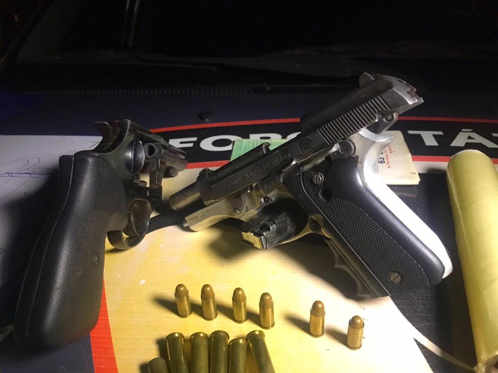 Segundo a PM, os suspeitos correram para dentro da casa ao perceberem a aproximação dos policiais e começaram a atirar. A polícia conta que os dois estavam armados. Um com uma pistola semi automática calibre 7,65 e o outro com um revólver calibre 38.