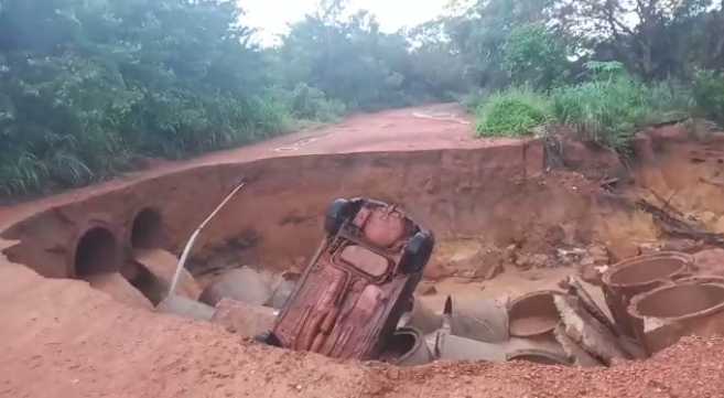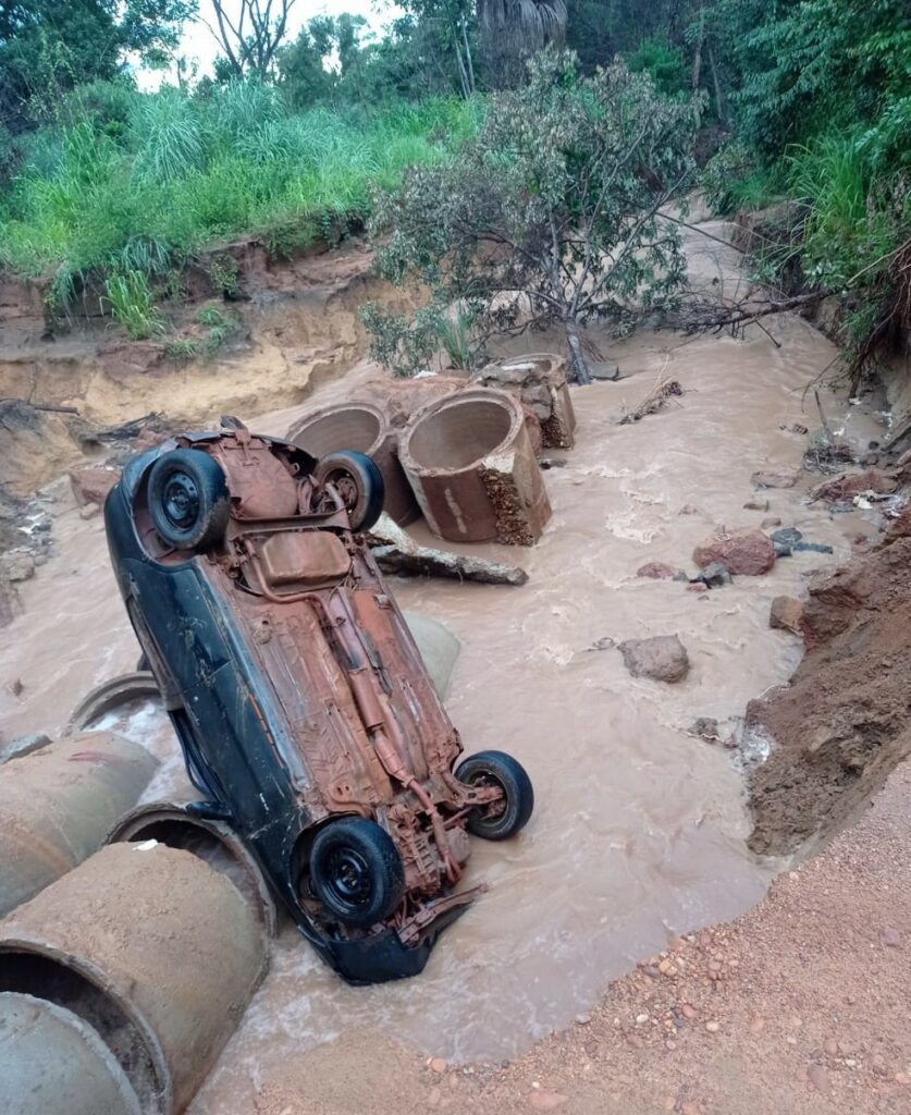Imagens feitas no local mostram o carro tombado dentro da cratera, em cima de manilhas de concreto e com todas as rodas para cima.