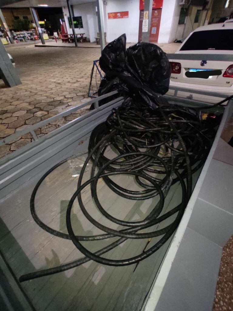 Durante busca veicular, foram encontrados 100m de fios de cobre, os quais estavam alocados em um reboque sem devido emplacamento.