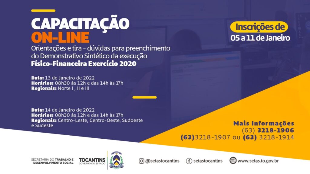 O Governo do Tocantins, por meio da Secretaria Estadual do Trabalho e Desenvolvimento Social (Setas), promove uma orientação regionalizada on-line aos municípios tocantinenses, na quinta e sexta-feira, 13 e 14, sobre o preenchimento do Demonstrativo Sintético como forma de prestar contas dos recursos federais. A orientação é direcionada aos gestores e técnicos da assistência social, e secretárias executivas dos Conselhos Municipais de Assistência Social (CMAS); e as inscrições podem ser realizadas até a terça-feira, 11, no link https://forms.gle/G6ZUsJnXbTsETvNw8.
