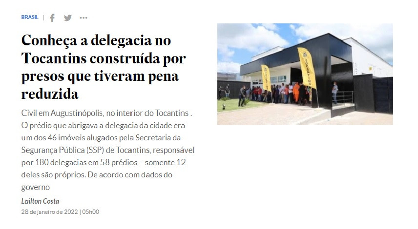 De iniciativa do delegado de polícia, Jacson Wutke, a construção do novo complexo que abriga delegacias da Polícia Civil (PCTO), em Augustinópolis, entregue pelo governador Wanderlei Barbosa no último dia 20 de janeiro, foi assunto de destaque e repercutiu na mídia nacional, em um dos maiores jornais do Brasil, o Estadão.