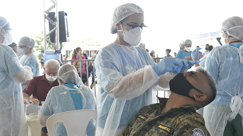 Foram aplicados 1,2 mil testes para detecção da Covid-19 na Megavacinação realizada, neste sábado, 22, em Palmas. Dos quais, 385 deram positivo para a doença. O evento do Ministério da Saúde (MS) ocorreu no Espaço Cultural José Gomes Sobrinho e contou com apoio do Governo do Tocantins e da Prefeitura Municipal. O balanço é parcial. As pessoas que tiveram a doença detectada passaram pela equipe médica que estava no local e foram encaminhados ao isolamento domiciliar.