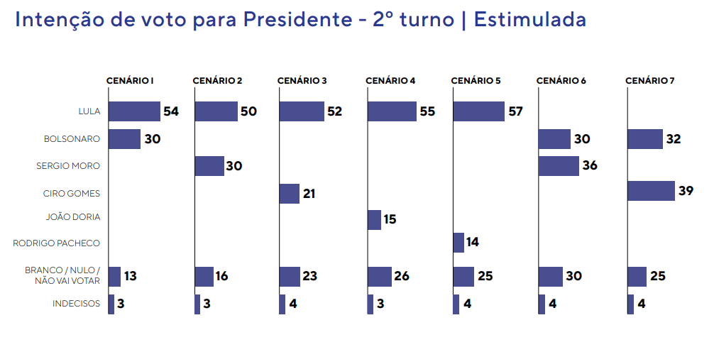 No segundo turno contra Bolsonaro, Lula tem 54%, enquanto o atual chefe do governo federal tem apenas 30%.
