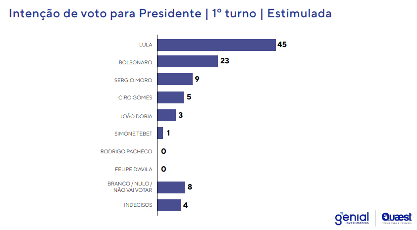 Os dados da pesquisa estimulada mostram que o petista tem 45% das intenções de voto, seguido de longe por Jair Bolsonaro (PL), que tem 23%. Na sequência aparecem Sergio Moro (Podemos) com 9%, Ciro Gomes (PDT) com 5% e João Doria (PSDB) com 3%.