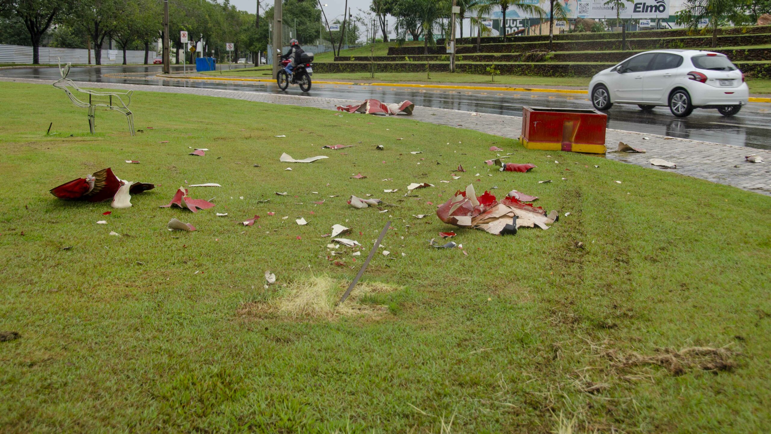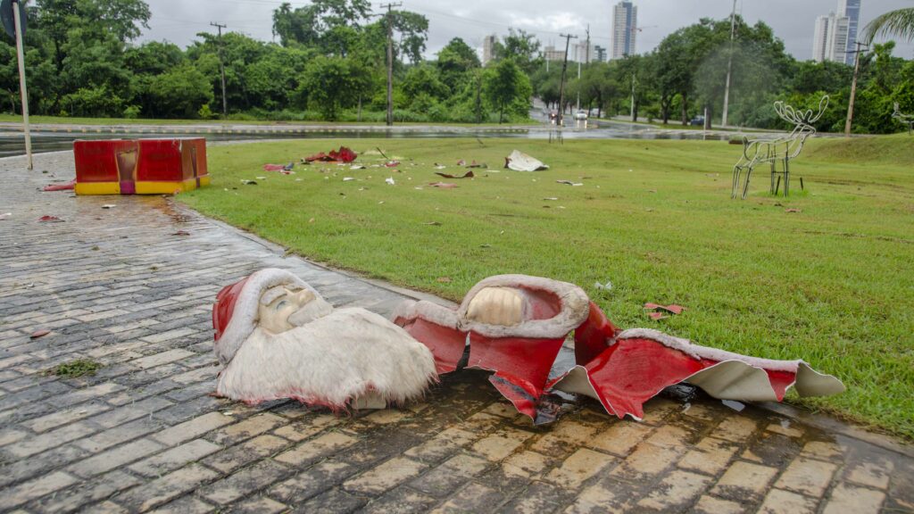 Parte da decoração natalina instalada na rotatória do Relógio das Flores, na Avenida NS-02, acima da feira da 304 Sul, em Palmas, foi destruída após alvo de vandalismo. A suspeita é de que o ato ocorreu entre o final da noite de sexta-feira, 07, e a manhã deste sábado, 08.