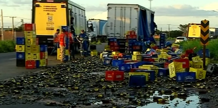 Início » Carga de engradados de cerveja cai na BR-153 e atrapalha trânsito