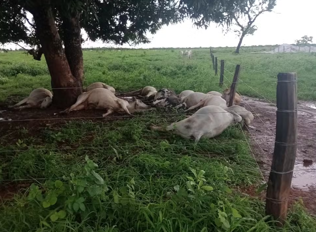 Pelo menos 11 vacas morreram após serem atingidas pela descarga elétrica de um raio em Taipas, na região sudeste do Tocantins. Os animais estavam debaixo de uma árvore no pasto de uma fazenda.