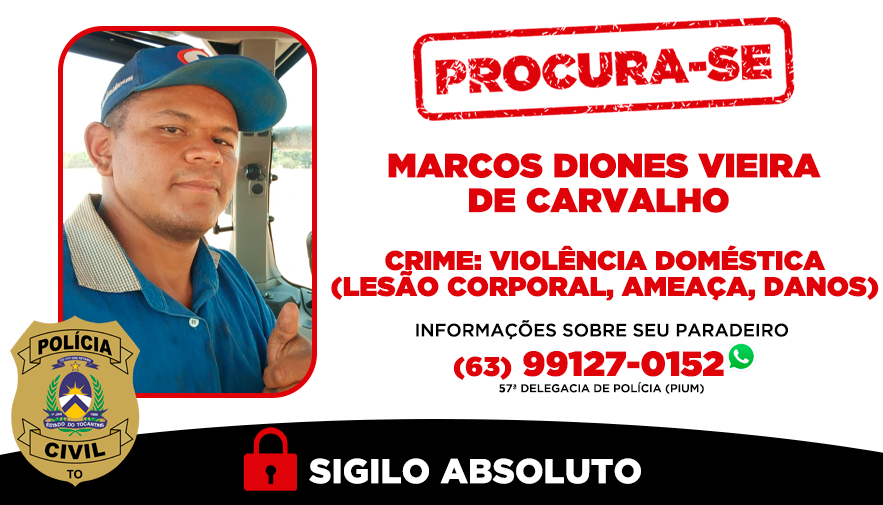 A Polícia Civil do Tocantins, por meio da 57ª Delegacia de Polícia de Pium, está à procura de Marcos Diones Vieira de Carvalho, 27 anos, investigado por diversos crimes relacionados à violência doméstica contra sua ex-companheira.