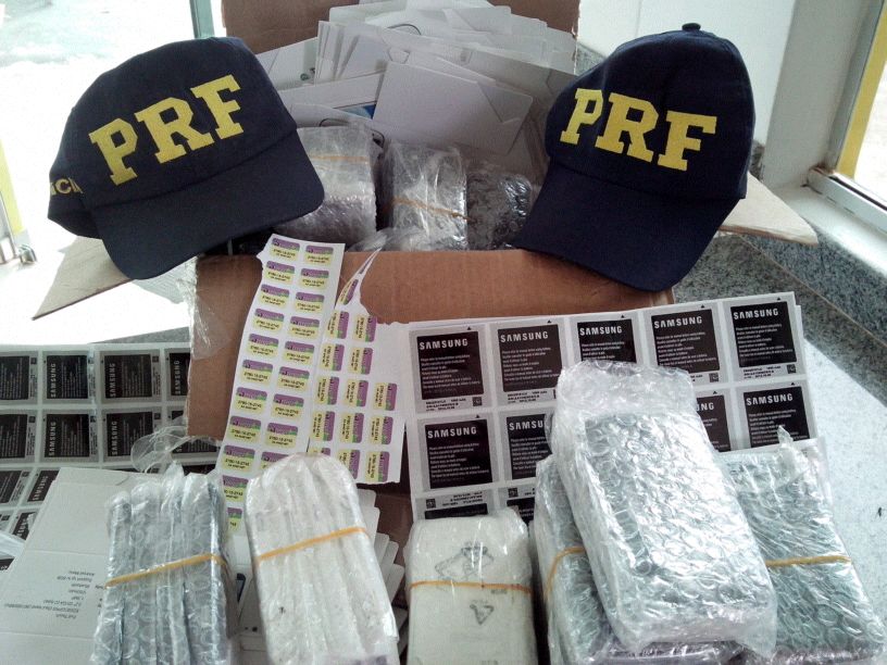 Por volta das 10:30h desta terça (4), durante abordagem de rotina a um ônibus de linha regular, itinerário Goiânia (GO) a Imperatriz(MA), agentes da PRF localizaram em seu bagageiro (compartimento de encomendas) duas caixas, sendo que a primeira armazenava 45 celulares, carregadores, baterias, fones de ouvido, 45 etiquetas falsificadas de baterias originais SAMSUNG, 54 selos falsificados da marca Samsung e a outra com 30 celulares , carregadores, baterias, fones de ouvido, 29 etiquetas falsificadas da marca Samsung, 37 selos falsificados ANATEL, 30 selos falsificados de Galaxy SIII, 45 selos falsificados marca Samsung . As caixas estavam identificadas com os dados das respectivas notas fiscais apresentadas pelo transportador, porém, os produtos descritos nas Notas Fiscais eram completamente diferentes dos produtos encontrados no interior das caixas.