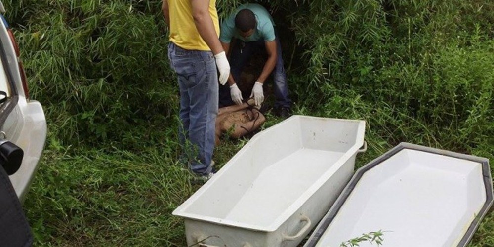 Os homens aparentando ser bem jovens estavam amarrados com as mãos para trás e com sinais de disparos de arma de fogo na cabeça.