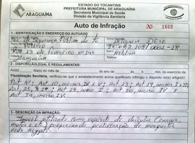 A Secretaria de Segurança Pública do Tocantins (SSP) foi multada em R$ 20 mil por causa de diversos focos do mosquito Aedes aegypti que foram encontrados no pátio da Delegacia Especializada em Investigações Criminais (Deic) no setor Neblina, em Araguaína.
