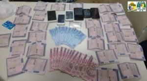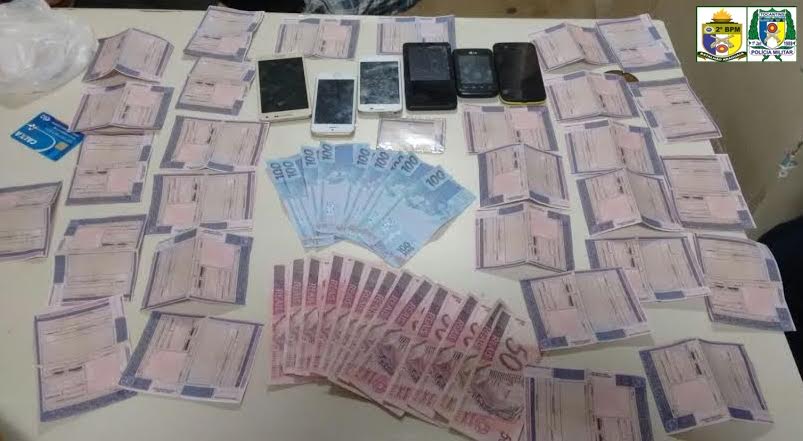 A PM foi acionada e informada sobre o roubo. Durante patrulhamento os policiais localizaram o suspeito de posse dos aparelhos celulares, sendo um deles da vítima. Durante buscas na residência do indivíduo os policiais encontraram carteiras de habilitação falsas, notas falsas de dinheiro impressas apenas de um lado que totalizariam R$ 1.650,00 (mil e seiscentos e cinquenta reais), além de notebook e celulares.