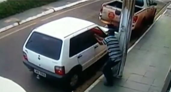 As imagens mostram o momento em que um homem de camisa listrada se aproxima de um carro branco e dispara em direção ao interior do veículo. Dentro do carro estava Jurandir Alves Feitosa, de 41 anos, que morreu na hora.