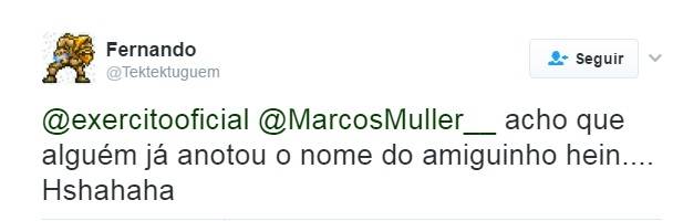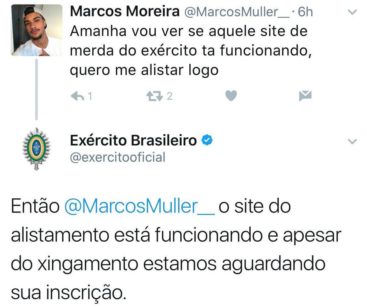 Em resposta, o Exércio tuitou “Então @MarcosMuller__ o site do alistamento está funcionando e apesar do xingamento estamos aguardando sua inscrição”.