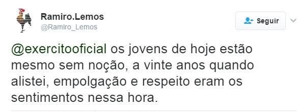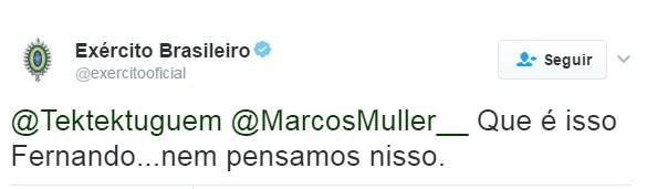 Embora comedido, o puxão de orelhas em Moreira rendeu piadas e mais broncas a ele na rede social. Um tuiteiro escreveu “acho que alguém já anotou o nome do amiguinho hein….” e também foi respondido pelo Exército, que foi sarcástico: “que é isso… nem pensamos nisso”. (Veja)