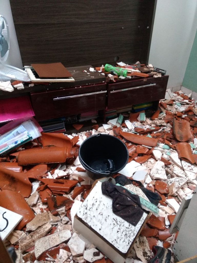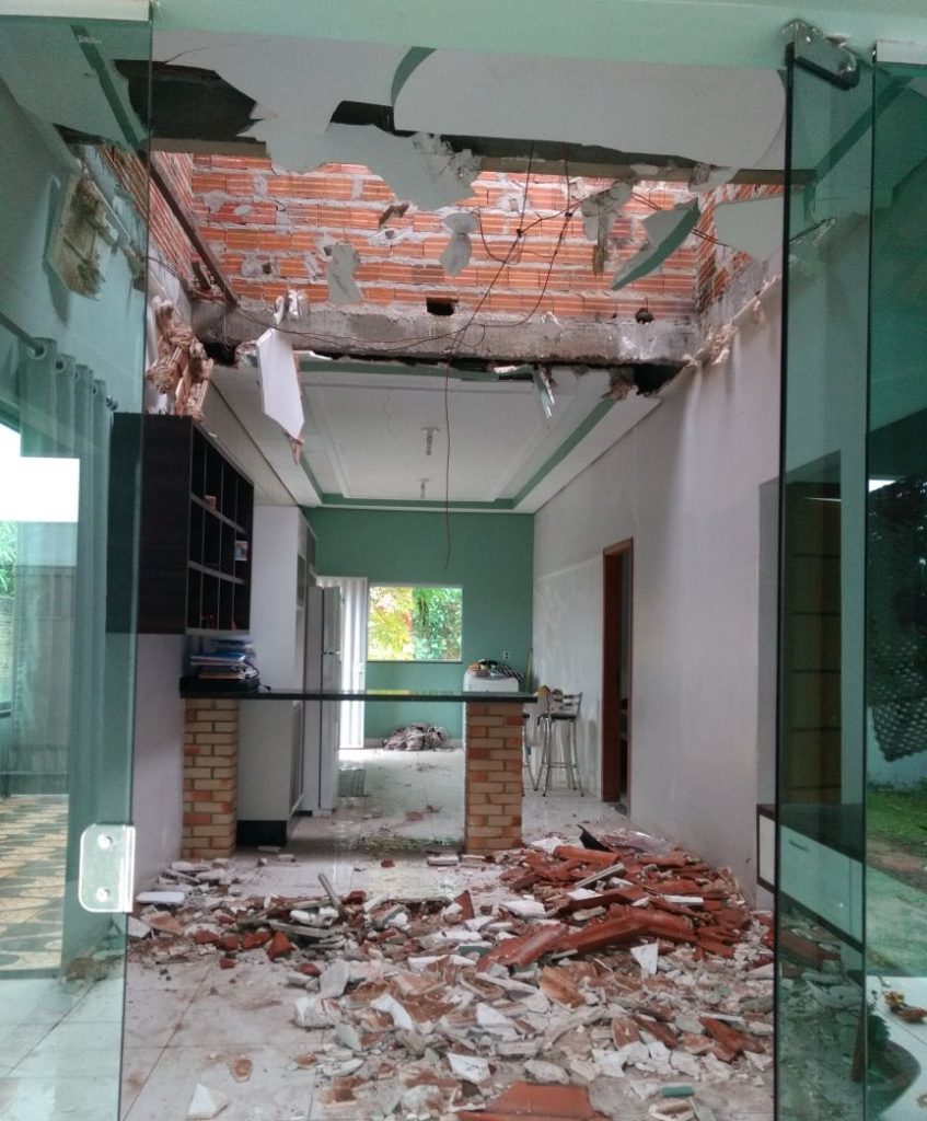 Partes do forro que sobrou está cheio de rachaduras e com o risco de desabar qualquer momento. Para a professora e seu esposo só tem a agradecer a Deus pelo livramento de sua família. Maria contou ainda que o alarme da cerca elétrica e o padrão de luz queimaram. Os prejuízos ainda não foram contabilizados.