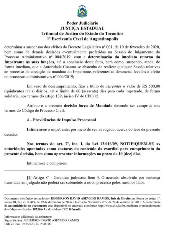 A Justiça determinou nesta quarta-feira, 19, o retorno de Júlio da Silva Oliveira (PRB), ao cargo de prefeito de Augustinópolis. Ele foi cassado no início da última semana, mas se recusou a deixar o cargo e entrou com uma ação na justiça, mandado de segurança contra sua cassação.