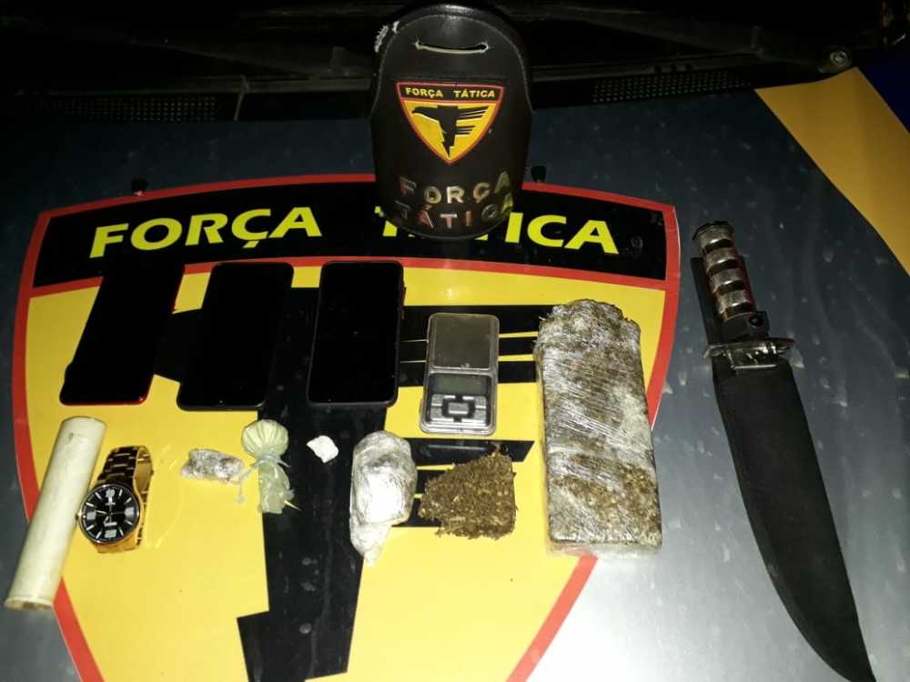 Após informações via Sistema Integrado de Operações Policiais (SIOP), na madrugada desta quinta-feira, 17, as equipes de Força Tática juntamente com o Batalhão de Polícia de Choque (BPCHOQUE) deslocaram até o Setor Maracanã, onde foi realizada busca pessoal no primeiro suspeito, um homem de 18 anos. Ele estava de posse de uma pequena porção de substância análoga à maconha. Em seguida, na residência havia mais três suspeitos sendo eles, dois homens 18 e 21 anos e uma adolescente, 15 anos. Momento em que foram encontrados um tablete do mesmo entorpecente e insumos sugestivos de preparação para comercialização da droga, bem como uma balança de precisão, plástico filme e pequenas embalagens. Ao ser questionado, o primeiro suspeito, um jovem de 18 anos, informou que comprou a substância no valor de mil e quinhentos reais e que o homem, 21 anos, seria o revendedor.