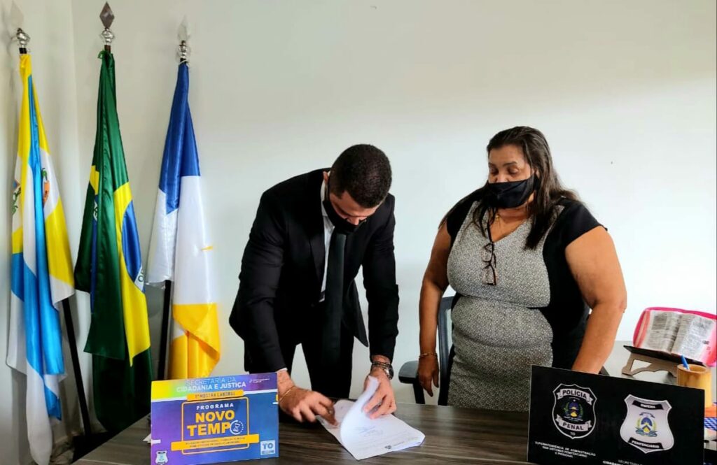 Como desdobramento do Programa Novo Tempo, o Secretário de Estado da Cidadania e Justiça, Heber Fidelis, juntamente com o Superintendente do Sistema Penal, Orleanes de Sousa Alves, e gestores da Gerência de Reintegração Social, Trabalho e Renda ao Preso e Egresso, estiveram na manhã desta sexta-feira, 19, no município de Novo Acordo para apresentar os avanços do Programa e como municípios tocantinenses podem se beneficiar. Diante disso, foi assinado um Termo de Cooperação entre a prefeitura e a Seciju para produção de artefatos de concreto que serão utilizados em benfeitorias no município.