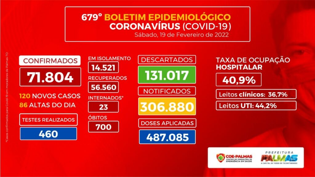 O Boletim Epidemiológico de n° 679, deste sábado, 19, traz a constatação de que 120 pessoas testaram positivo para Covid-19 nas últimas 24 horas, em Palmas. Dos novos casos, 74 são em pacientes mulheres e 46 em homens. Todos os pacientes foram encaminhados para o isolamento domiciliar.