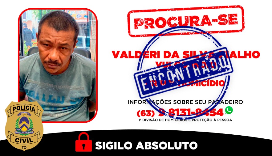 Na última sexta-feira, 16, a Secretaria da Segurança Pública por meio da Polícia Civil pediu apoio da população no sentido de localizar o foragido Valderi da Silva Fialho, vulgo Índio, 44 anos, investigado por um crime de homicídio ocorrido ano passado em Palmas. Após denúncia anônima, o investigado foi localizado e capturado por policiais militares do 1º Batalhão da Polícia Militar, no final da tarde deste domingo, 18, na região do Loteamento Água Fria, em Palmas.