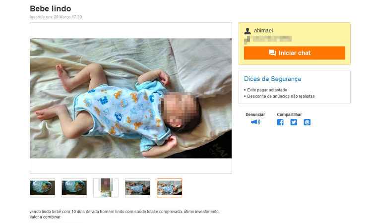 A publicação é acompanhada de uma galeria com cinco fotos da criança. A localização é o Bairro Tropical, em Contagem. Nesta terça-feira 29, não é possível acessar o anúncio diretamente pelo site, mas a mensagem foi armazenada em cache na internet.