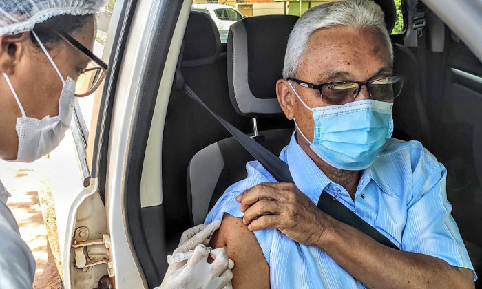 Fenelon Barbosa, de 80 anos, primeiro prefeito de Palmas e pai do Vice-governador do Tocantins, Wanderlei Barbosa, recebeu, nesta terça-feira, 23, a primeira dose da vacina contra a Covid-19. O imunizante foi aplicado em um Posto de Saúde de Taquaruçu, às 11 horas, pela técnica em enfermagem, Meiriane França.