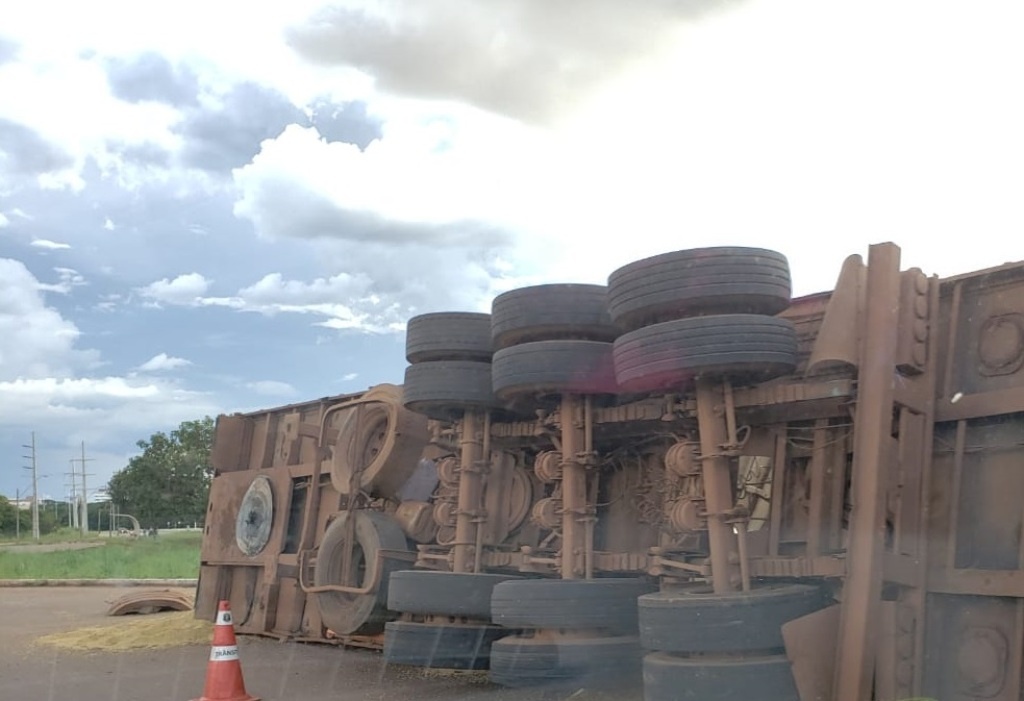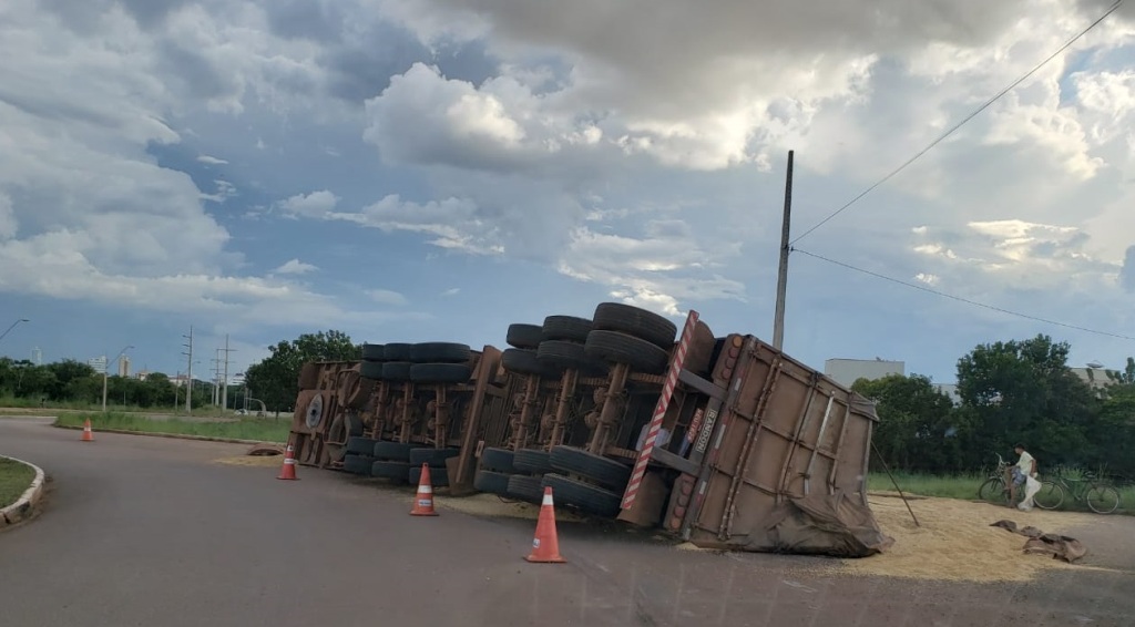 Na tarde dessa terça-feira, 30, um caminhão carregado com soja tombou no momento em que fazia uma rotatória na LO-12, região norte de Palmas.