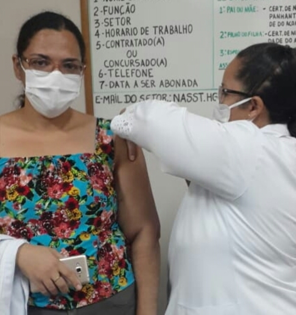 Raquel foi uma das servidoras vacinadas com segunda dose da CoronaVac. Cerca de mais de 1.400 profissionais de saúde do hospital já foram imunizados na primeira dose. Segundo o Boletim Epidemiológico, da Secretaria de Saúde desta segunda, 01/03, o vacinômetro registrou 54.865 pessoas vacinadas em todo o Estado, o que representa 2,85% da população.