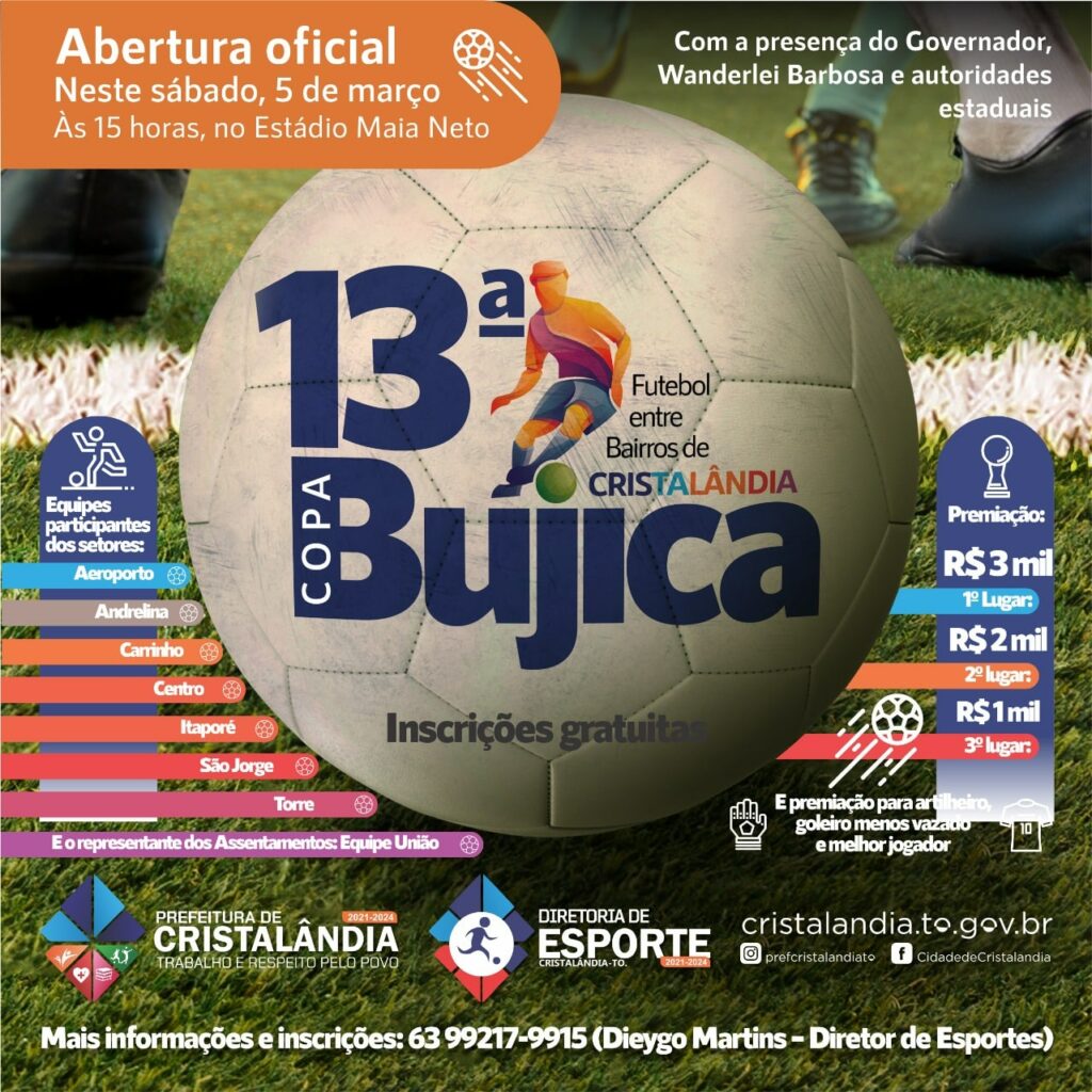 Cerca de 190 atletas competem a partir deste sábado, 05, na 13ª Copa Bujica de Futebol entre Bairros de Cristalândia, realizada pela Prefeitura de Cristalândia, por meio da Diretoria de Esportes. A abertura oficial está marcada para às 15 horas, no Estádio Maia Neto, com a presença do Governador Wanderlei Barbosa, e de diversas autoridades estaduais e locais, tendo como anfitrião o prefeito de Cristalândia, Big Jow.
