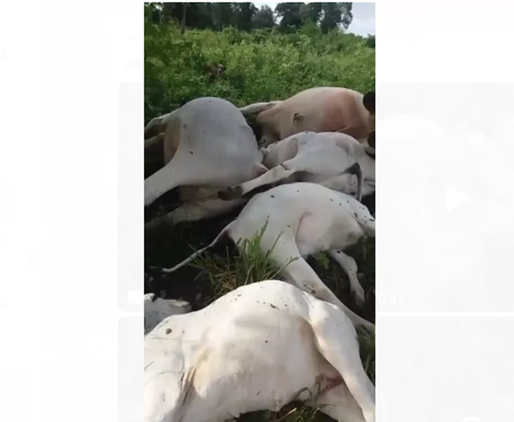 Um raio matou nove cabeças de gado em uma fazenda na zona rural de Lagoa da Confusão, na região oeste do Tocantins. Segundo os donos da propriedade, os animais foram atingidos quando estavam debaixo de uma árvore para se proteger da chuva. Imagens feitas no local mostram o boi, a vaca e os sete bezerros mortos.