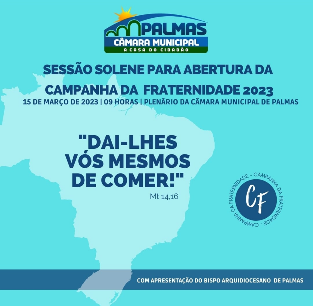 Em alusão à abertura da Campanha da Fraternidade de 2023, que este ano tem como lema “Dai-lhes vós mesmos de comer”, a Câmara Municipal de Palmas (CMP) realizará Sessão Solene nesta quarta-feira (15), a partir das 9 horas. A solenidade contará com a participação do Bispo Arquidiocesano de Palmas, Dom. Pedro Brito Guimarães.