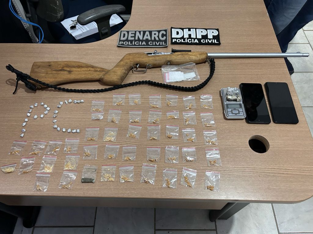 Uma mulher de 30 anos foi presa por tráfico de drogas, enquanto um homem de 19 anos foi detido por posse irregular de arma de fogo. Com a suspeita, os policiais encontraram porções de cocaína, 80 porções de crack e quatro porções de maconha, já fracionadas e preparadas para a venda, além de uma balança de precisão e um celular. Já com o homem, foi apreendida uma arma de ar comprimido adulterada.