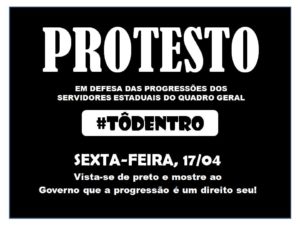 Está mantido para esta sexta-feira, dia 17, o protesto organizado pelos servidores públicos do Quadro Geral do Estado. A ação acontecerá em todos os órgãos estaduais na Capital e no interior e é uma decisão tomada pelos próprios servidores durante Assemb