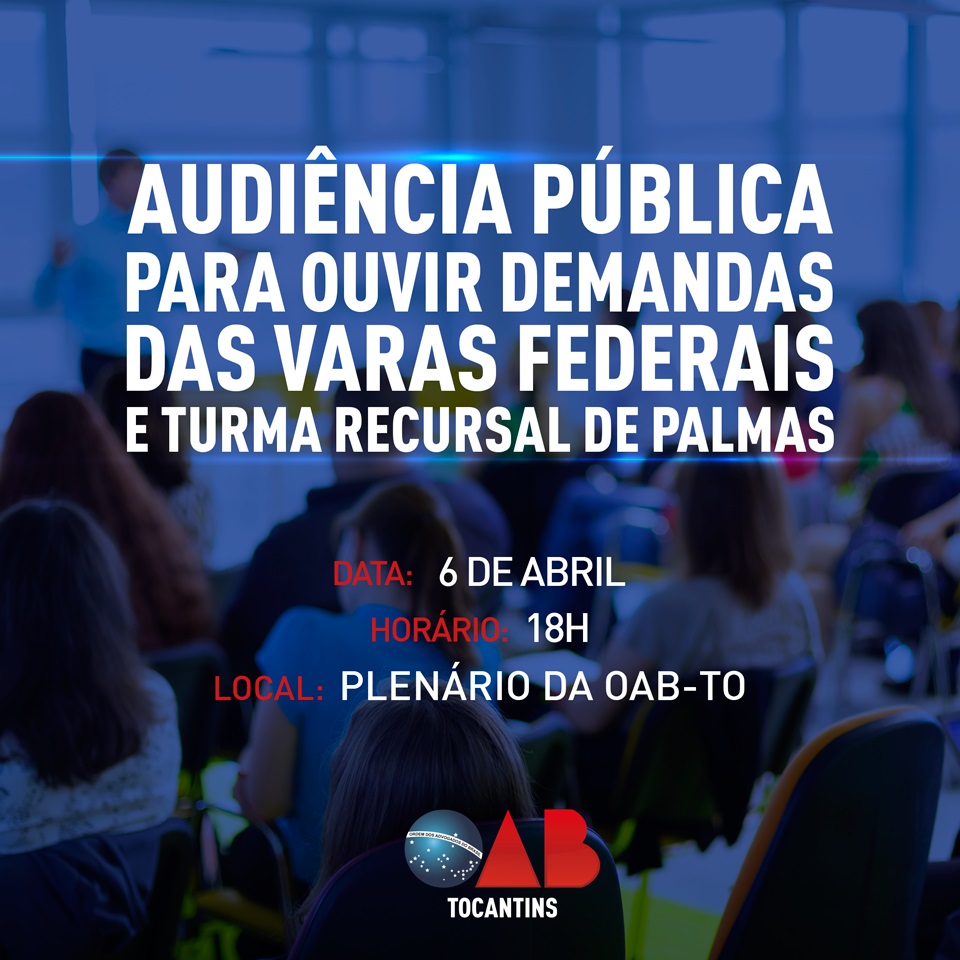 A OAB-TO (Ordem dos Advogados do Brasil no Tocantins) promove, nesta quarta-feira, 6 de abril, a partir das 18 horas, uma audiência pública para ouvir as demandas dos advogados palmenses sobre a Justiça Federal na Capital.