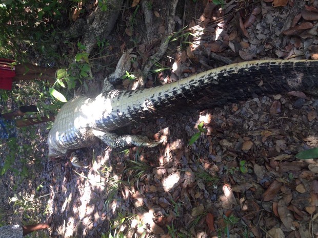 O réptil de aproximadamente 3 metros de comprimento foi encontrado nesta sexta-feira 22, próximo ao córrego Ponte Grossa, afluente do Rio Araguaia, há mais ou menos mil metros de onde Rogério sumiu.