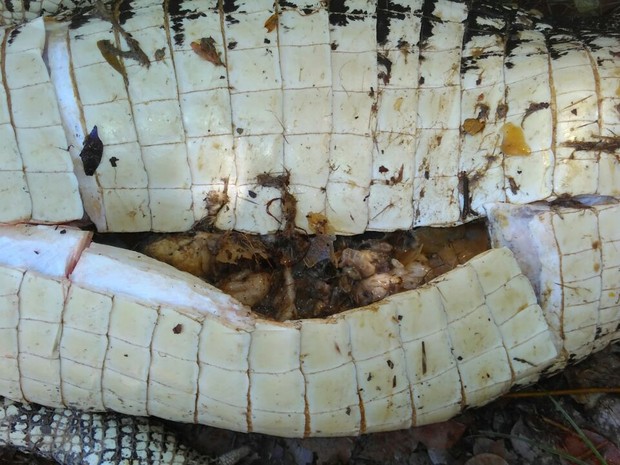 A Polícia Militar e o Instituto Médico Legal (IML) foram chamados, uma perícia será realizada com os tecidos encontrados na barriga do jacaré.