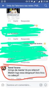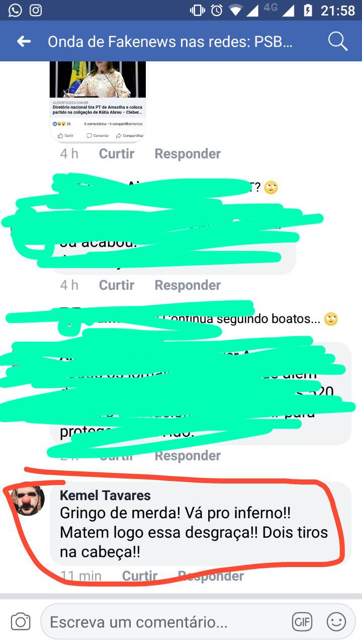 “Gringo de merda! Vá pro inferno!! Matem logo essa desgraça. Dois tiros na cabeça!!” Feita por Kemel Tavares em sua página no Facebook, essa ameaça de morte contra Carlos Amastha, ex-prefeito de Palmas e candidato a governador do Estado nas eleições de 3 de junho, está sendo apurada pelo departamento jurídico do Partido Socialista Brasileiro (PSB).