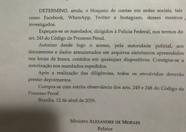 No mandado de busca, o ministro Alexandre de Moraes ordena à Polícia Federal apreender computadores, tablets, celulares e outros dispositivos eletrônicos encontrados nas casas dos suspeitos. O magistrado também determina que a PF tenha acesso a “documentos e dados armazenados em arquivos eletrônicos” e que colha os depoimentos de todos os alvos da operação. (Fonte: Thiago Bronzatto/Veja.Abril)