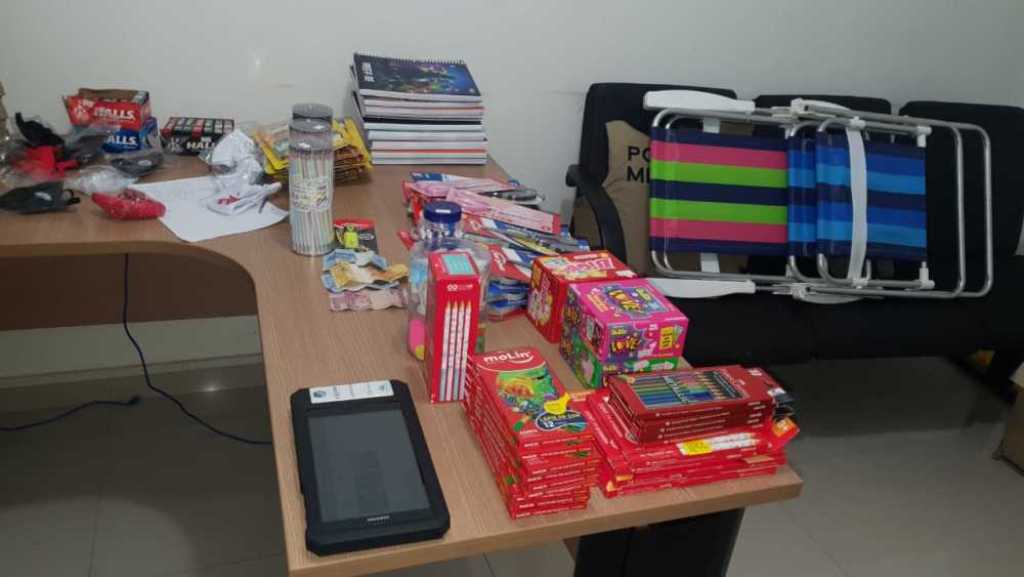 A Polícia Militar prendeu na madrugada desta quarta-feira, 21, no Setor Central em Araguaína,  norte do Tocantins, dois homens, 28 e 29 anos, pelo crime de furto. Durante a ação os policiais militares localizaram uma quantia pecuniária em espécie, 19 caixas de lápis de cor, três pacotes de balinhas, três pacotes de chicletes, 24 tesouras, dois pacotes de borracha, duas cadeiras de praia, uma caixa de caneta esferográfica, um lápis, dez cadernos de matéria, seis kits de lápis de cor e 13 máscaras de tecido. O material havia sido escondido pela dupla em um terreno baldio.