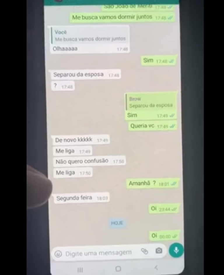 Em determinado momento da conversa, o amante questiona o traidor: “Separou da esposa?”, sendo prontamente respondido. “Sim. Queria você”. Os dois, então, combinam de se encontrar em uma segunda-feira. (Com: DOL)