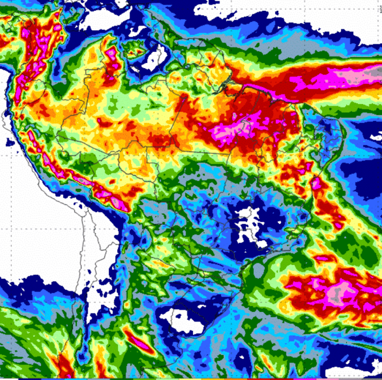Previsão de chuva em praticamente toda Região Norte, com acumulados variando, de maneira geral, entre 30 e 200 mm. Os maiores acumulados de chuva estão previstos para o Pará e norte de Tocantins.