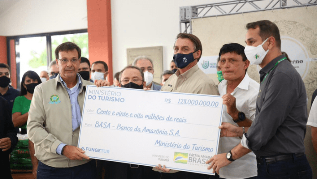 Uma cerimônia realizada nesta sexta-feira, 23, em Belém (PA), marcou a formalização de um repasse de R$ 128 milhões do Ministério do Turismo ao Banco da Amazônia (BASA), para a concessão de empréstimos por meio do Fundo Geral de Turismo (Fungetur). Na ocasião, o ministro do Turismo, Gilson Machado Neto, e o presidente Jair Bolsonaro entregaram um cheque simbólico ao presidente da instituição financeira, Valdecir José de Souza.