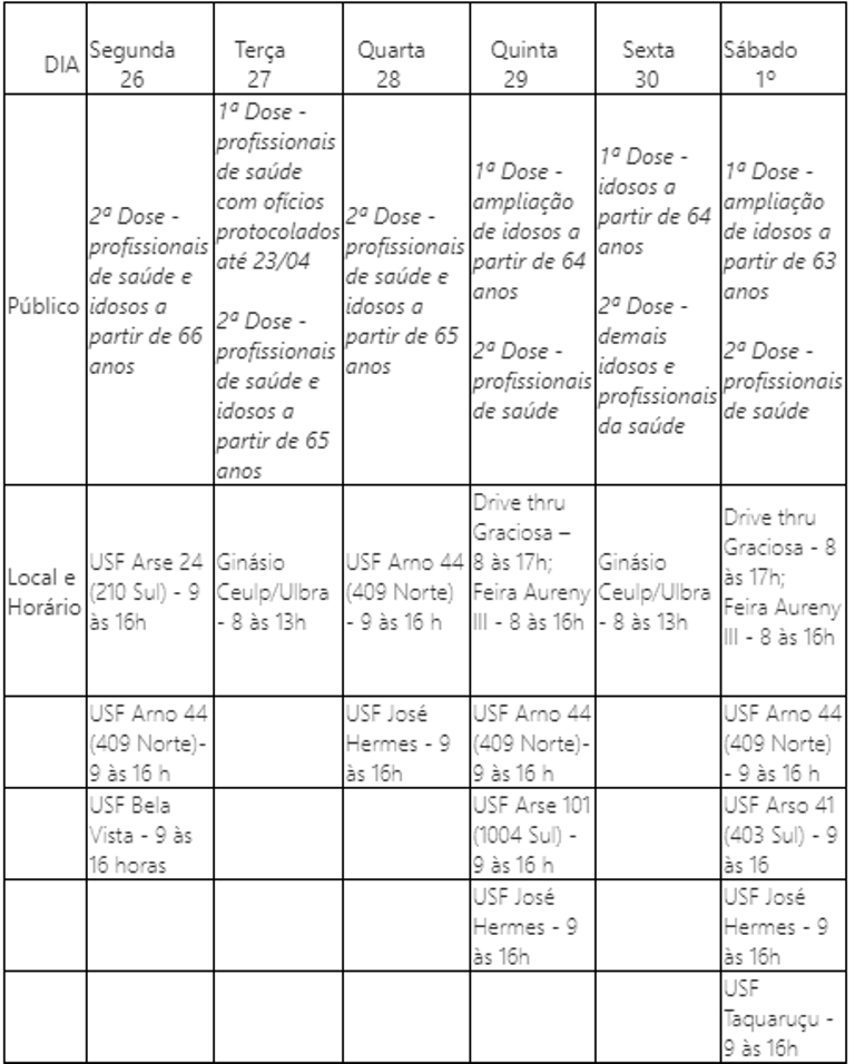 Em continuidade às ações de imunização para Covid-19 na Capital, a Prefeitura de Palmas, por meio da Secretaria Municipal de Saúde (Semus), executa na quinta-feira, 29, a aplicação da primeira dose em idosos a partir de 64 anos, e no sábado, 1º, será a vez dos idosos de 63 anos serem contemplados. Confira o cronograma e locais de vacinação no final da matéria.