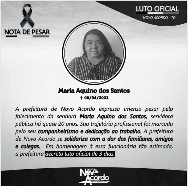 A Prefeita de Novo Acordo Deusany Batista, emitiu nesta quinta-feira (8), nota de pesar pela morte de Maria Aquino dos Santos , 58 anos, servidora pública.