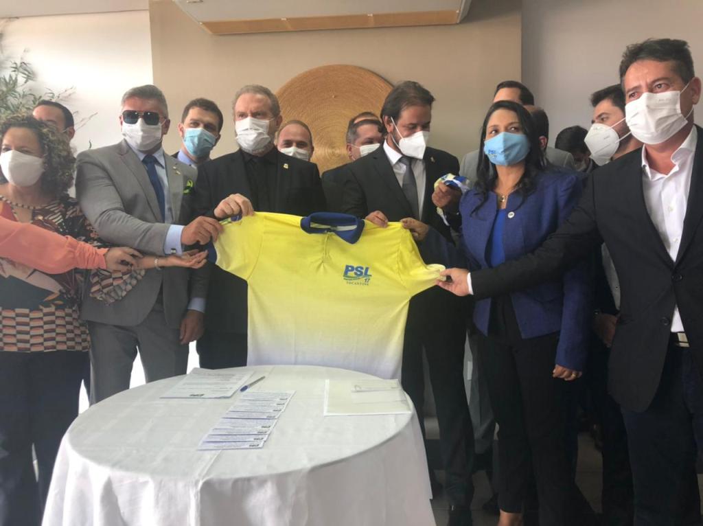 Ao lado do vice-presidente do PSL, Antônio de Rueda, e de deputados da bancada federal, Vanda Monteiro acompanhou a assinatura do documento e parabenizou o governador destacando a importância da adesão para a sigla e o Tocantins.